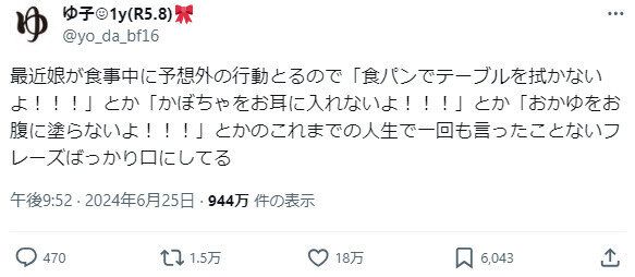 なかでも、娘さんが食事中に予想外の行動を取るために「これまでの人生で一回も言ったことがないフレーズ」が生み出されていたのだとか。