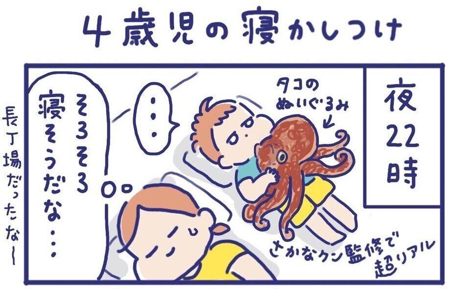 そろそろ寝そうな雰囲気からの「あっタコが起きちゃった」は大変でしたね。タコの寝かしつけには、どのくらいの時間がかかったのでしょうか。