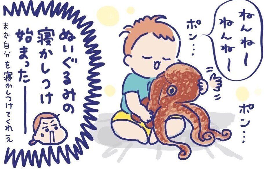 バッチリ目を見開いたタコのぬいぐるみを5分で寝かしつけたとは!素晴らしいですね(笑)