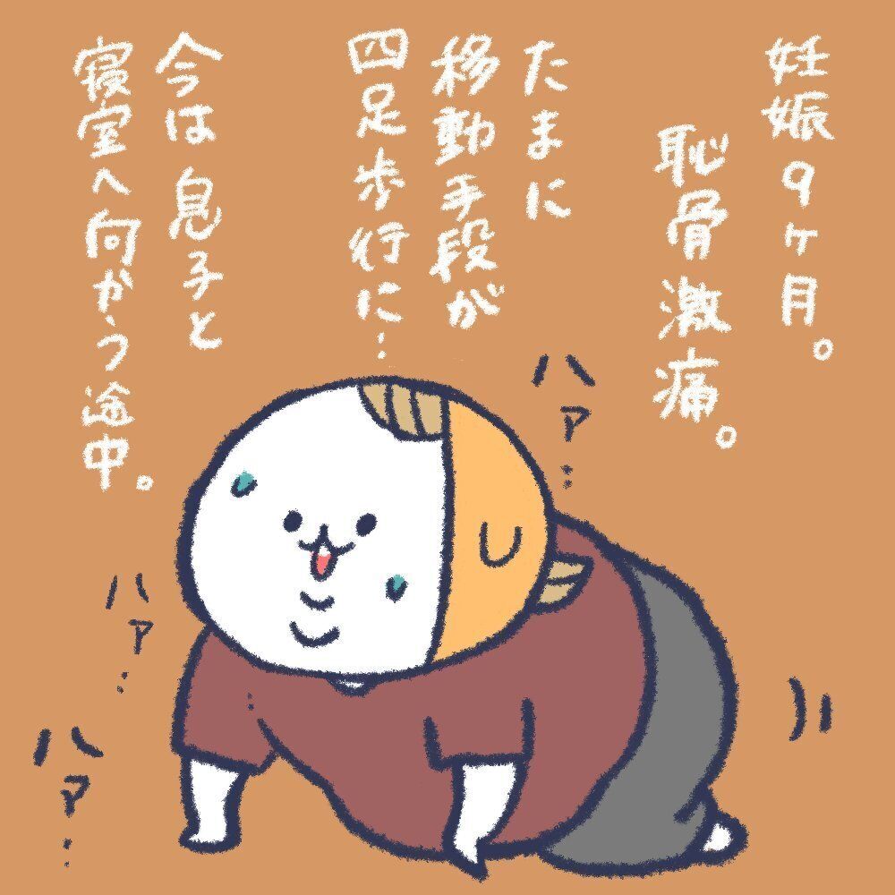 当時、妊娠9カ月の妊婦だったおうどんさんは、妊娠後期特有の恥骨痛に悩まされ、たまに四足歩行で移動していたのだそう。