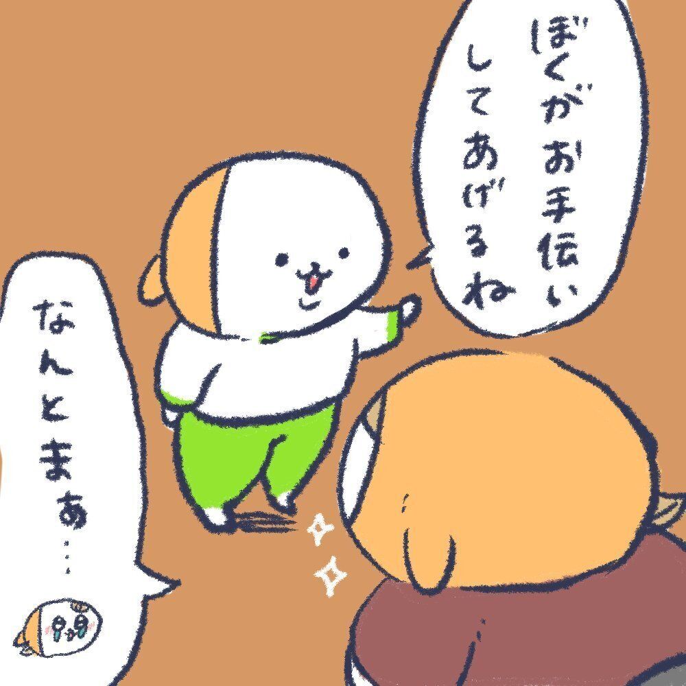 ママのためを思って、一生懸命お手伝いをしてくれたこうどんくん。ママが笑っているのを見て、キョトンとする姿もかわいくてたまりません。