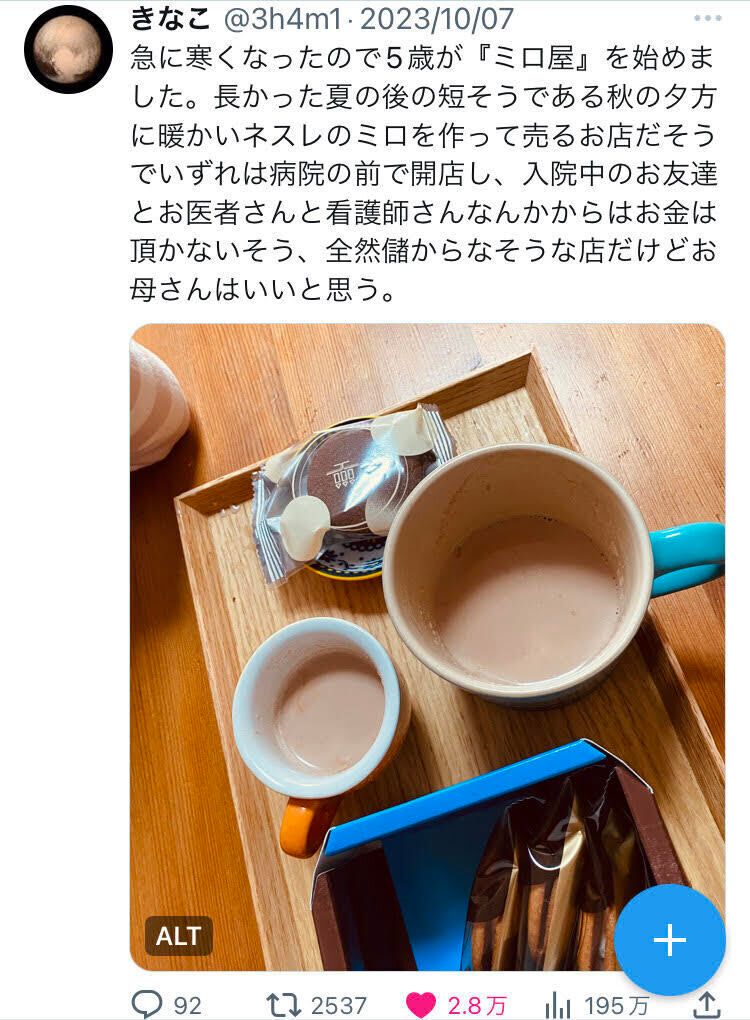 「11月上旬の急に寒くなった日に『何か温かい飲み物を飲もう』ということになって、たまたま冷蔵庫の隅にあったミロを娘に淹れてあげたら、思いのほかそれを気に入って『いいこと考えた!これをお店で売ったらどう?』ということで、開店となりました。ミロが世界的に普及している飲み物とは、まだ5歳なので知らなかったようです」