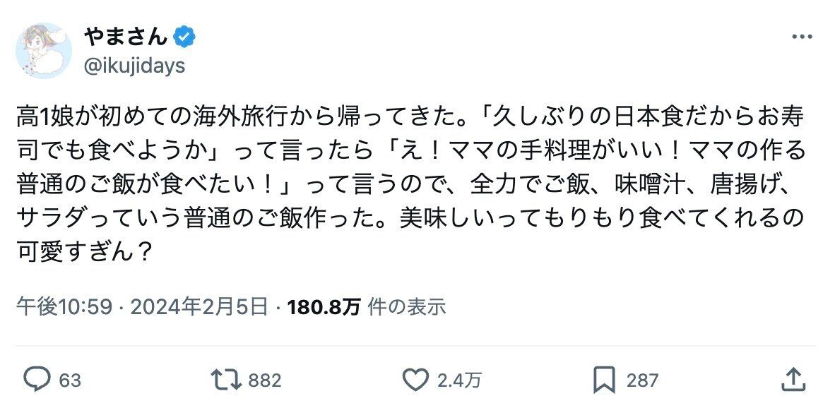 海外旅行から帰国した高1の娘。久しぶりの日本食にリクエストしたのは、お寿司ではなく「ある料理」だった!素敵な親子関係に2.4万人がほっこり