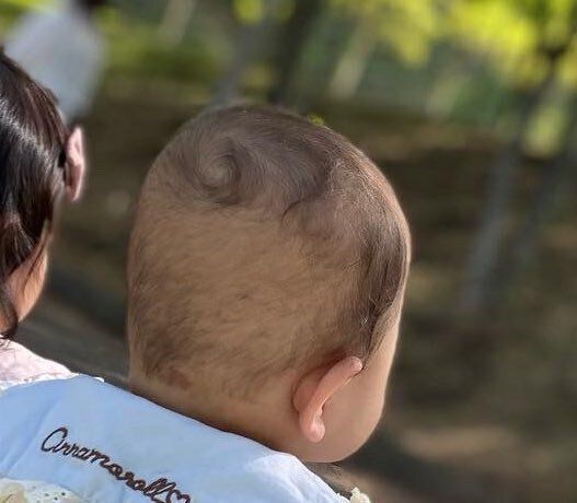 「髪の毛が生えてきたら夫譲りの癖っ毛であることがわかり、つむじも夫と同じぐるぐる巻きなのがわかりました」