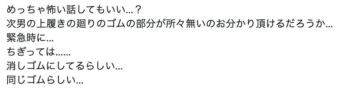 「妻に『〇〇(次男の名前)の上履き、なんで欠けているんだろうな?』と聞くと、消しゴムにしていたらしい…と。そこで発覚しました。妻も欠けていることを不思議に思い、帰宅時に次男に聞いていたそうです」