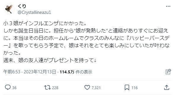 お誕生日当日にまさかのインフルエンザ、娘さんもご家族も大変でしたね。「ホームルームでクラスのみんなに『ハッピーバースデー』を歌ってもらう予定」だったとのことですが、娘さんはどれくらい楽しみにしていたのでしょうか。