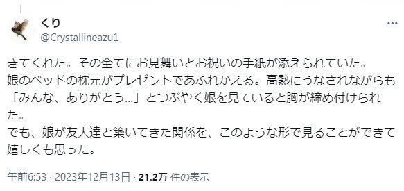 まだ熱にうなされながらも「みんな、ありがとう…」とつぶやく娘さんの姿に、胸が締めつけられる思いだったというくりさん。一方で、娘さんがお友だちと築いてきた関係性を見ることができてうれしくもあったのだそう。
