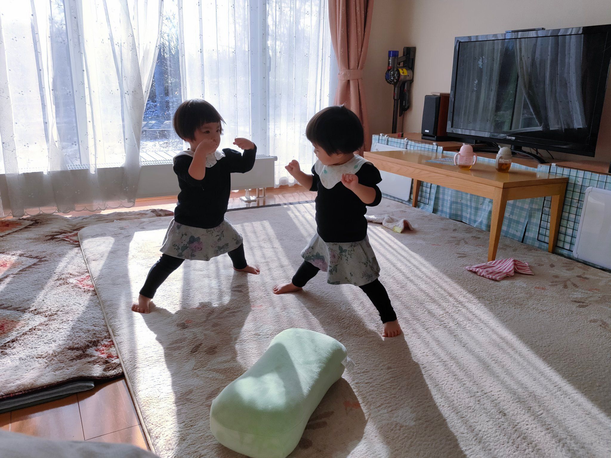 楽しそうな声が聞こえてきたので、ふと顔を上げると双子の娘ちゃんたちが思わぬポーズをとっていました。