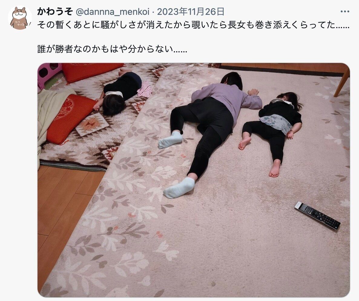 ちなみにその後は、小学2年生のお姉ちゃんも巻き込んで遊びつくし、3人で仲良く眠る姿も投稿されています。