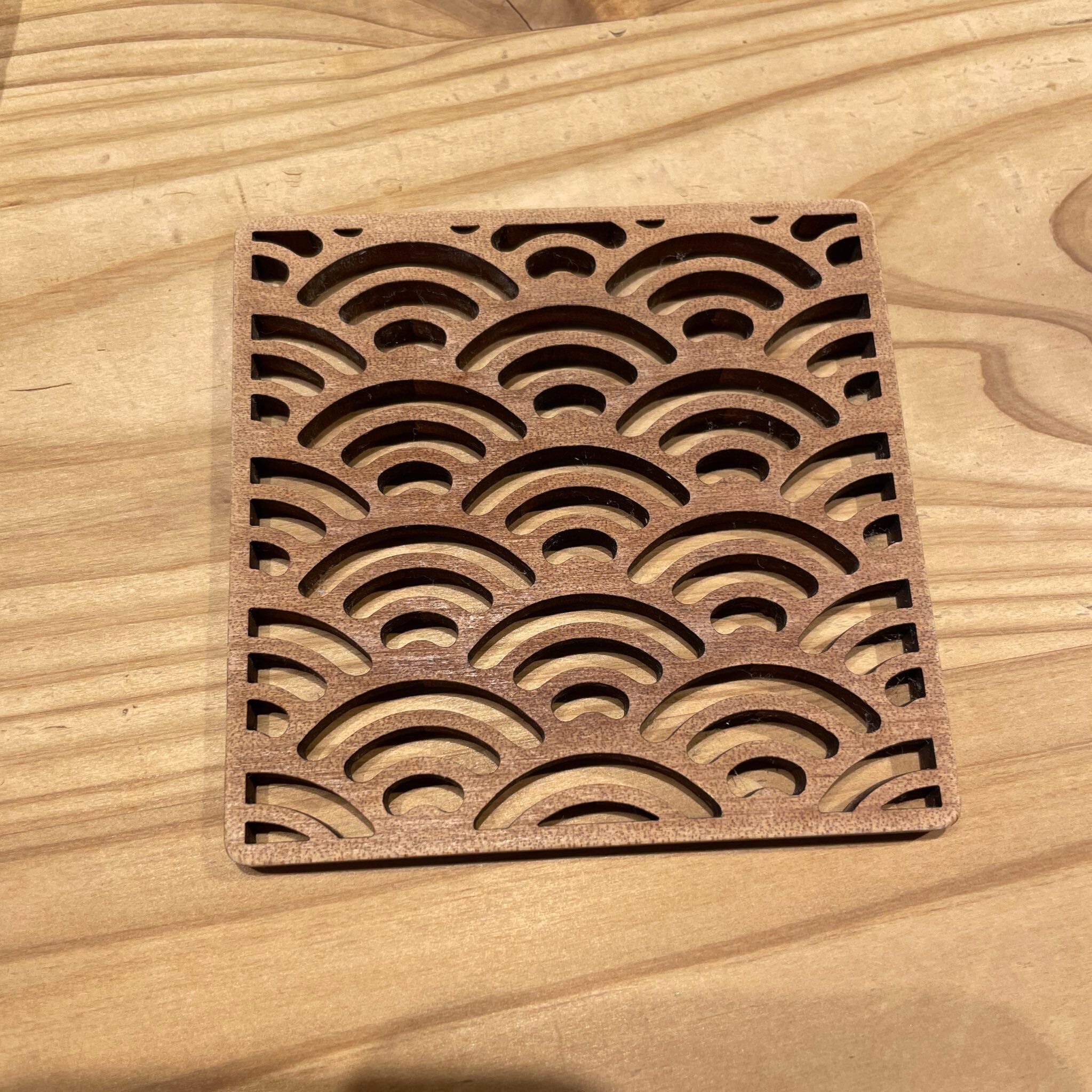 波模様の和柄が透かし彫りされた木製コースターを目にした娘さん。