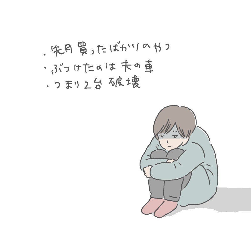 先月買ったばかりの車を夫の車にぶつけてしまい、合わせて2台壊してしまったことになるそう…。膝をかかえて落ち込む姿からも哀愁を感じます。