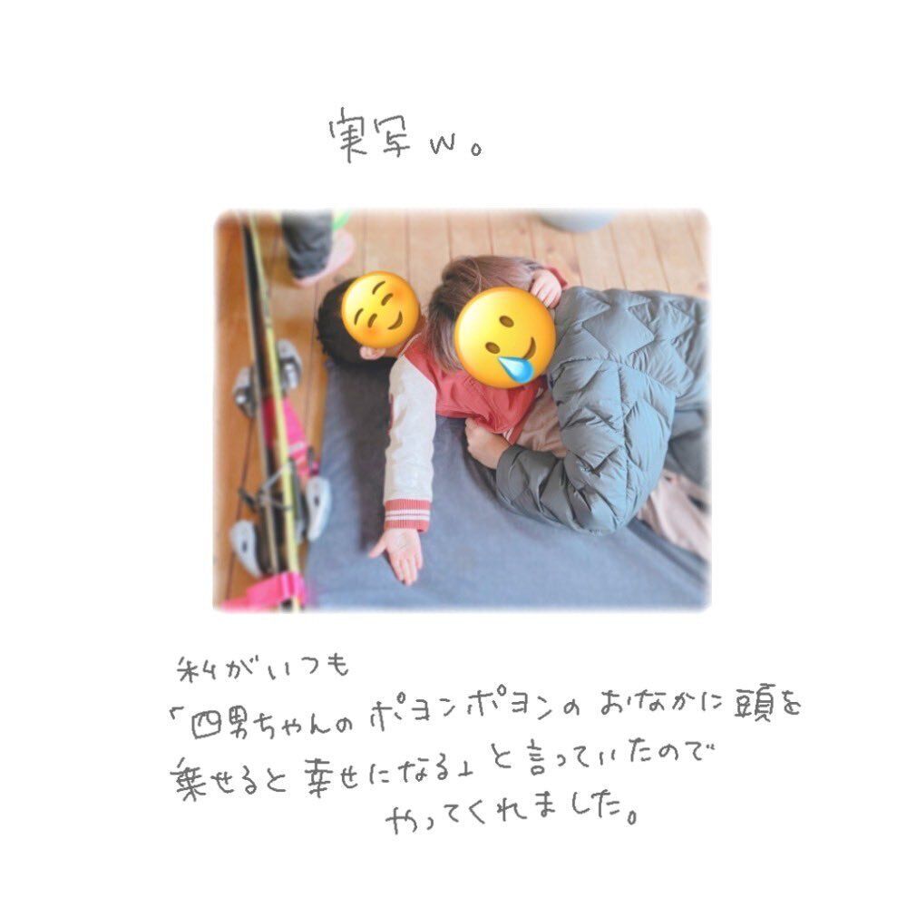 ふだんから「お腹に頭に乗せると幸せになる」と言っていたのを覚えていて、いであいさんが落ちこんだタイミングで提案してくれたのですね。四男くんの優しさにほっこりするエピソードです。
