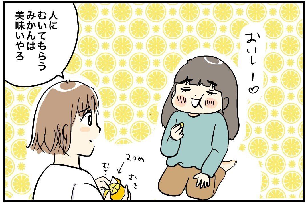 「人にむいてもらうみかんは美味いやろ」と、娘さんのために皮をむいてあげています。美味しそうに食べる娘さんの姿にも癒されますね。