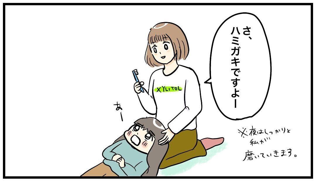「鼻をつまんだのは確かそのときだけで、あとはおとなしく仕上げの歯磨きをされていました。ずっと鼻をつまんでいたとしたら、私もおもしろくて仕上げ磨きができなかったかもしれません」