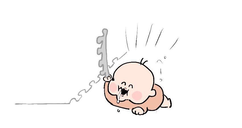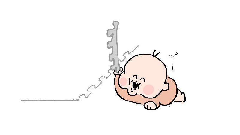 楽しそうにハイハイしているのは、サチコさんの次女・ネネちゃん。右手に持っているのは、ジョイントマットのはしっこ部分です。遊んでいるうちにはがれてしまったのかな?
