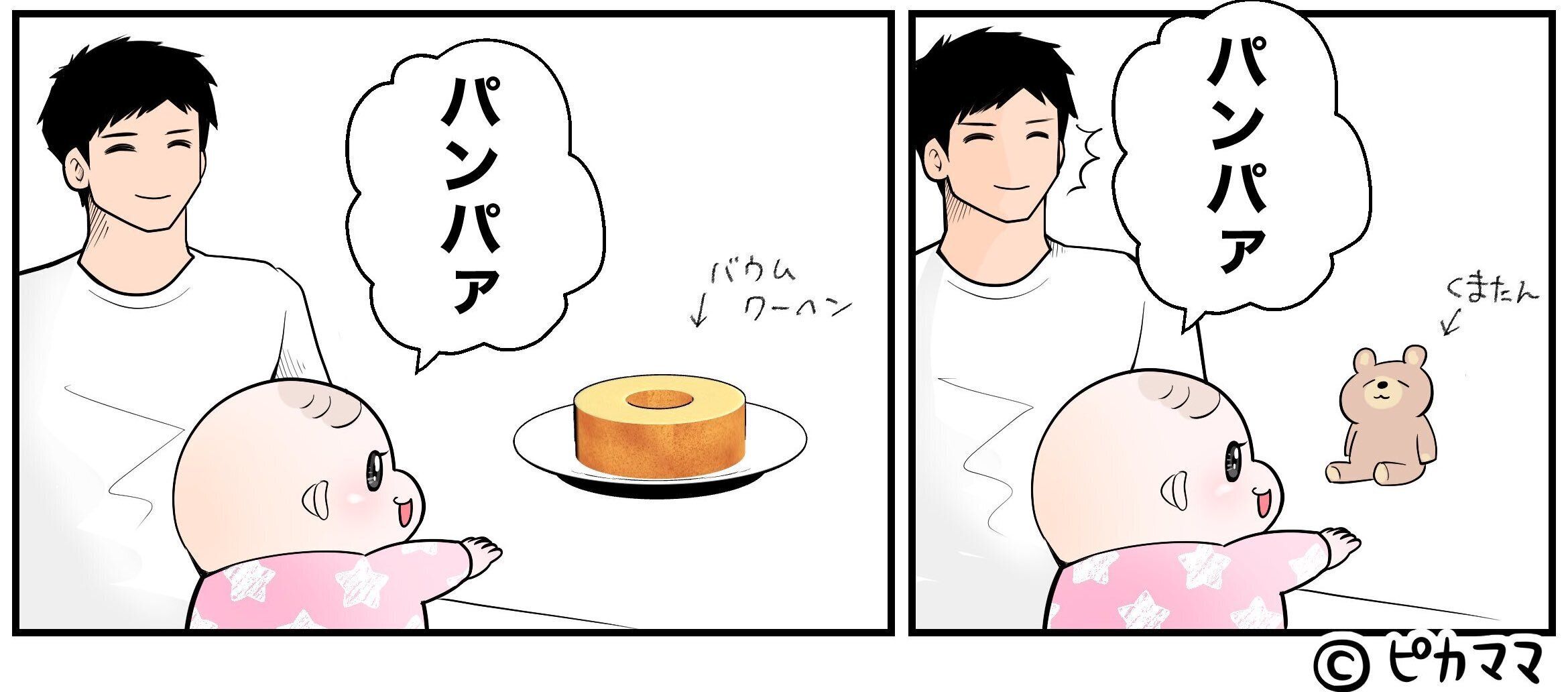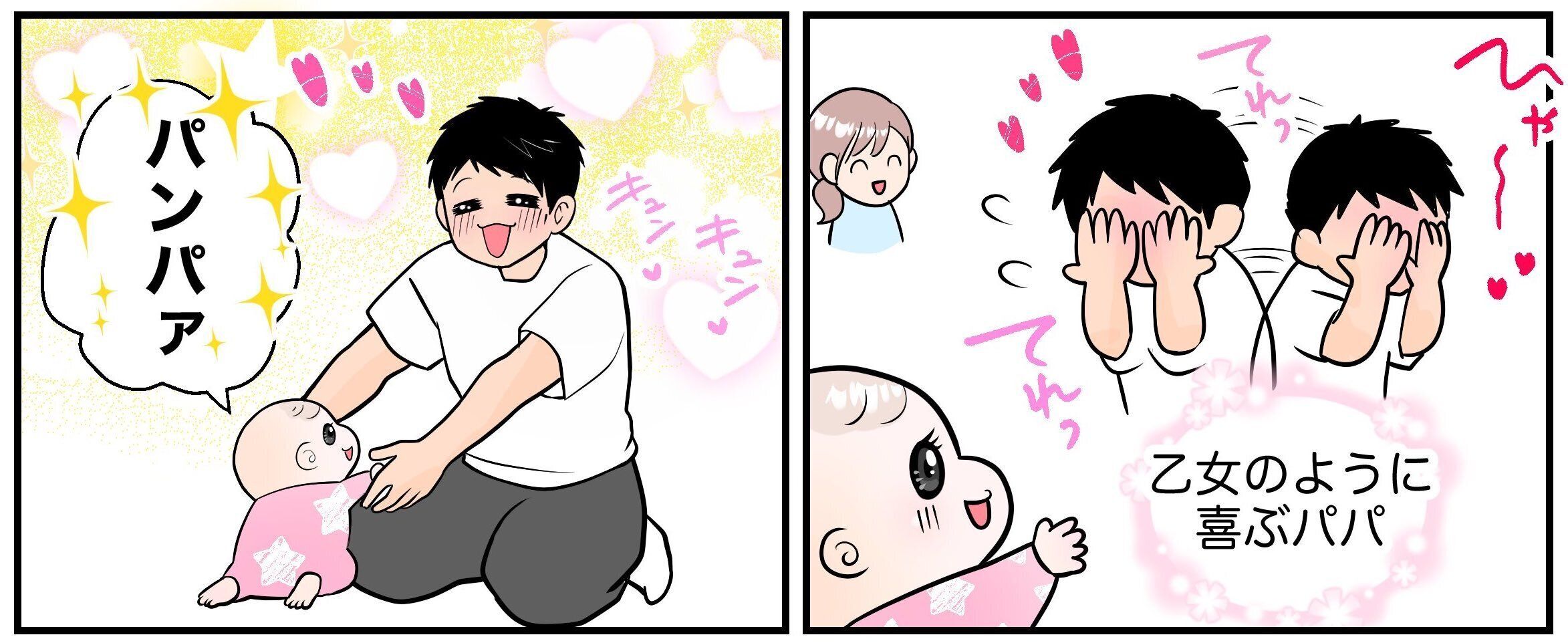 「パパは当時『やっぱりママは特別なんだなぁ』とつぶやいて、少しへこんでいましたね。でもママなら仕方がない、という感じです。とはいえ、ピカちゃんがパパに『パンパァ』と駆け寄っていくと『どちたー???』と、うれしそうに即抱っこしています(笑)パパとしては、汎用性の高い『パンパァ』でも、ピカちゃんからの呼びかけは、何でもかわいくてうれしいのでしょうね」