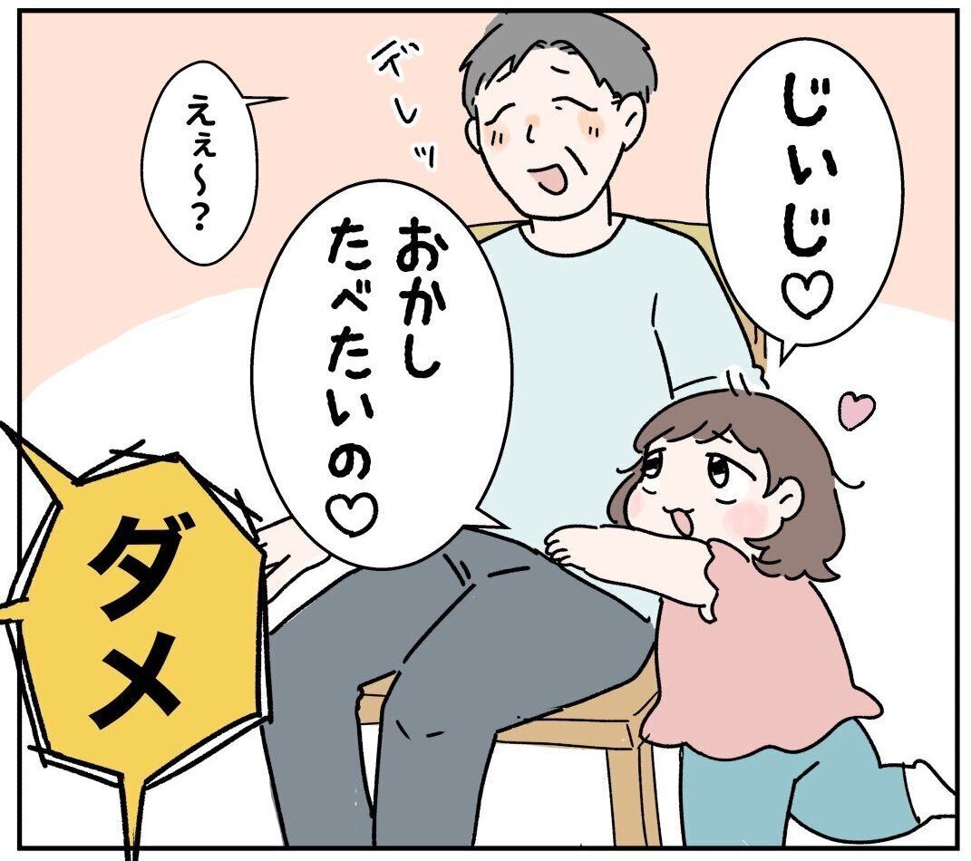 ターゲットのおじいちゃんに「じぃじおかしたべたいの」と甘えるぽんちゃん。
