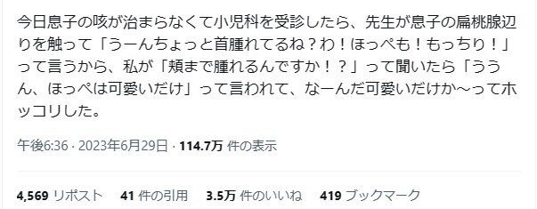 先生は、息子さんの扁桃腺の腫れを確認したあと「わ!ほっぺも!もっちり!」と一言。