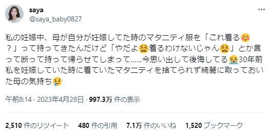 sayaさんのお母さんが「これ着る?」と持ってきたのは、かつてお母さんがsayaさんを妊娠していたときに着ていたマタニティ服。sayaさんは「やだよ、着るわけないじゃん」と断り、持って帰ってもらいました。しかし、ふと思い出すとsayaさんには後悔の気持ちが。