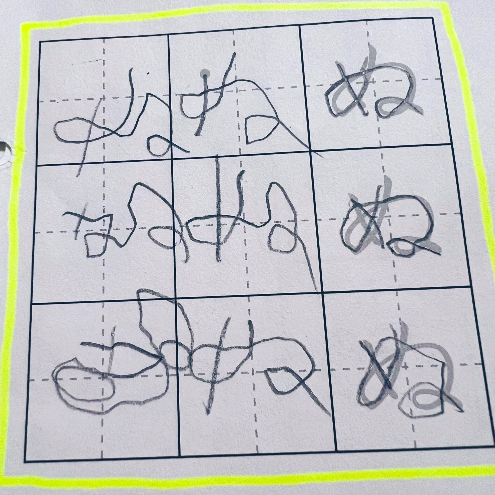 始めはお手本の線をなぞるところからスタートし、4つ目からは自分だけの力で書いています。