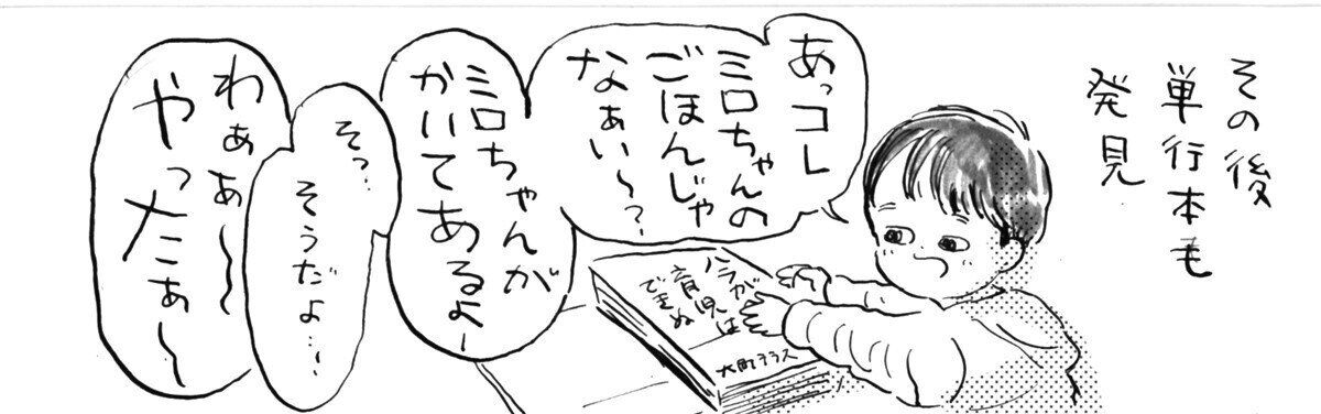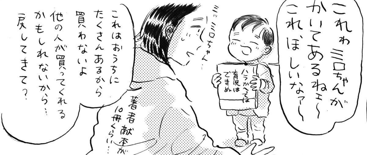 本を手に取りニコニコするミロちゃんですが、作者はママ。家には同じ本がすでに何冊もあります。