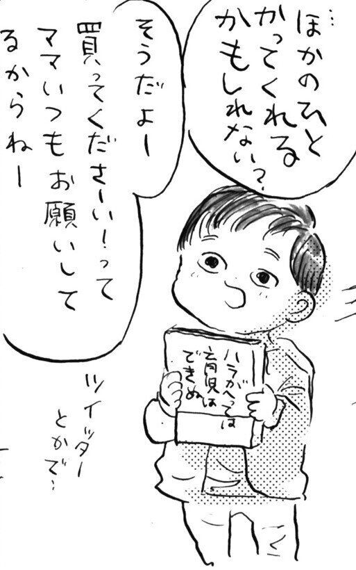 不思議そうにするミロちゃんを、テラスさんは「そうだよー。買ってくださーい!ってママいつもお願いしてるからねー」と諭します。