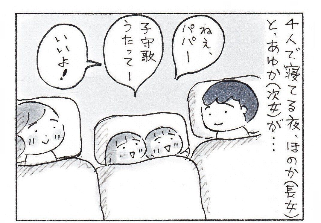 娘のほのかちゃん、あゆかちゃん、そして2人を挟んでパパとママの4人で布団に横になり、さあ寝ようというときのこと。