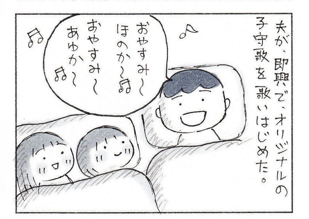 「歌詞もオリジナルで楽しいのか、パパの子守歌を子どもたちは好きで、よくパパに子守歌をリクエストしています」