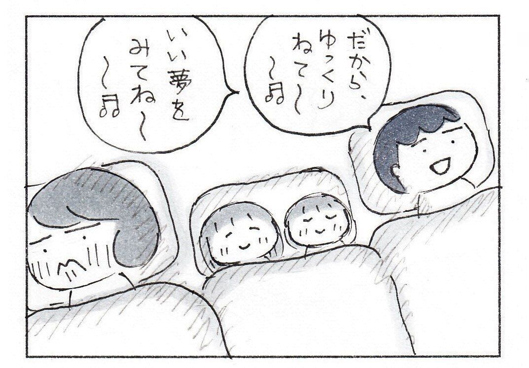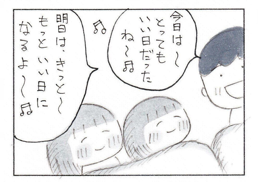 娘さんたちもパパの愛情たっぷりの歌を聴きながら、いつの間にか眠ってしまったようです。家族4人、幸せな気持ちで眠れそうですね。