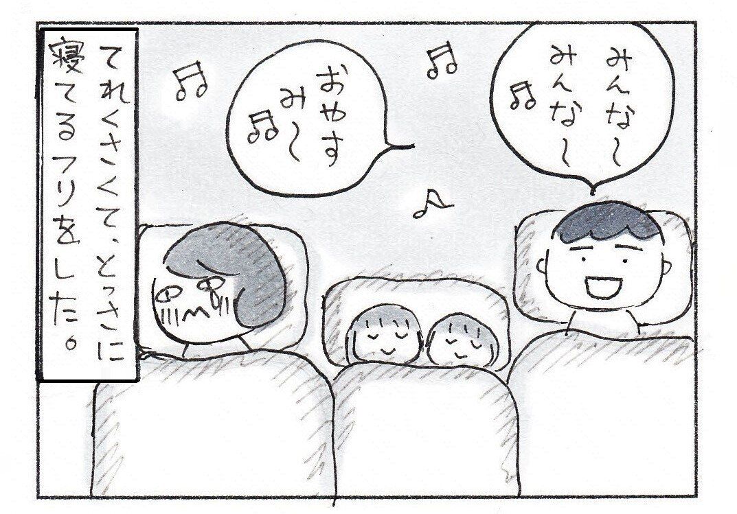 なりたりえさん(@rienarita)が「子守歌で、よく眠れた日。」と題してTwitterに漫画を投稿しました。家族で寝ようというとき、パパに子守歌をお願いした娘さんたち。リクエストに応えたパパの歌詞がりえさんの心にやさしく届きました。