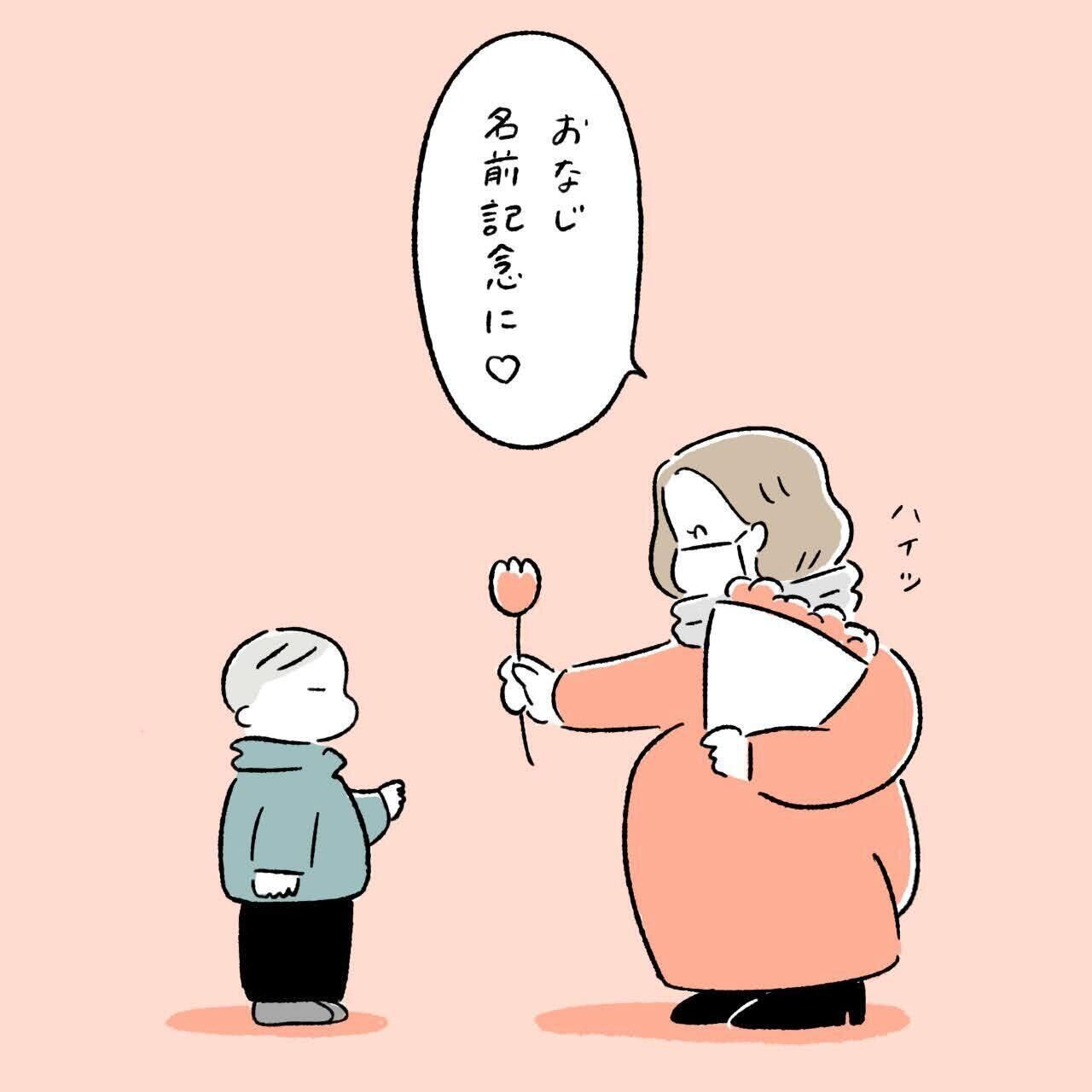 「同じ名前記念に」と言いながら、息子くんと同じ目線までしゃがんで手渡してくれるお姉さん。その様子に、お姉さんのやさしさが感じ取れます。