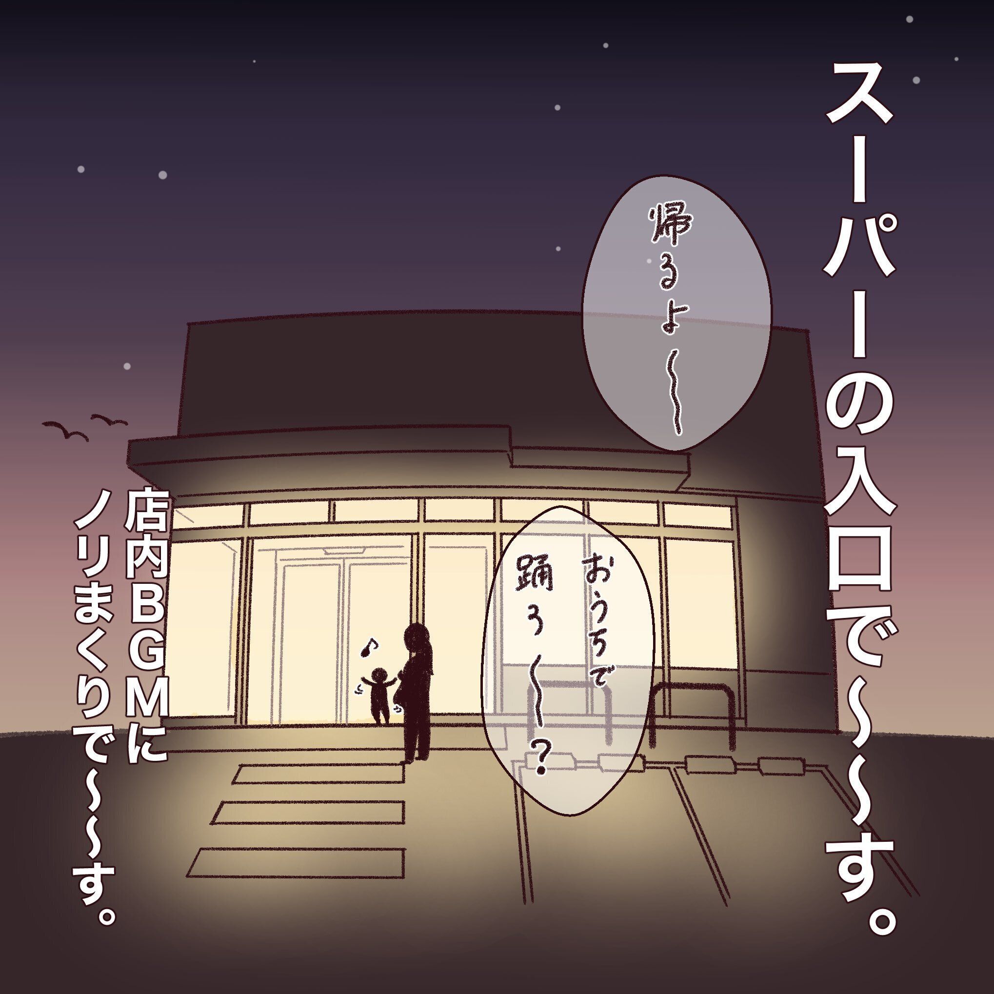かわいいわが子の踊る姿はどれだけ見ていても飽きませんが、それがスーパーの入口となると話は別です。お気に入りの曲で、お家でもたっぷりダンスを楽しんでほしいですね。