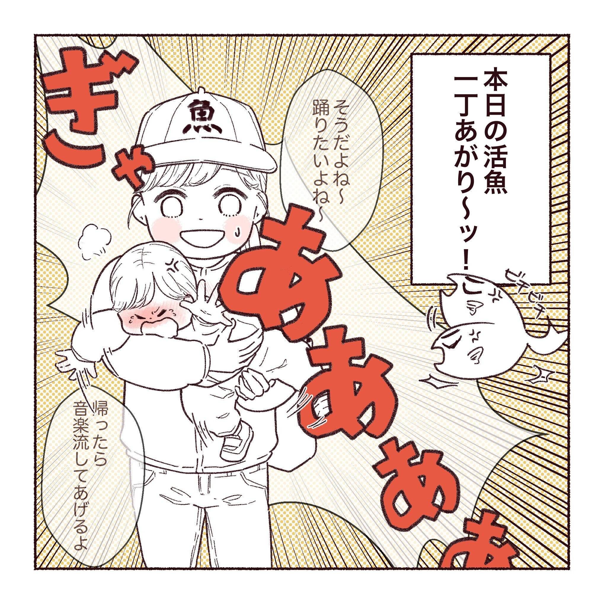 踊りを中断され「ぎゃああああ」と泣きわめくたっちゃんは、まるでビチビチと暴れる魚のようです。あまりの活きのよさに、「本日の活魚 一丁あがり~ッ!」と魚屋さんの気分を味わったたすこさん。