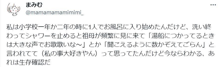 まみむさん自身が子どもだったころ、お風呂に入ると外から「お歌を歌いな~」と言われていたのは、生存確認だったのだと気が付いたそうです。
