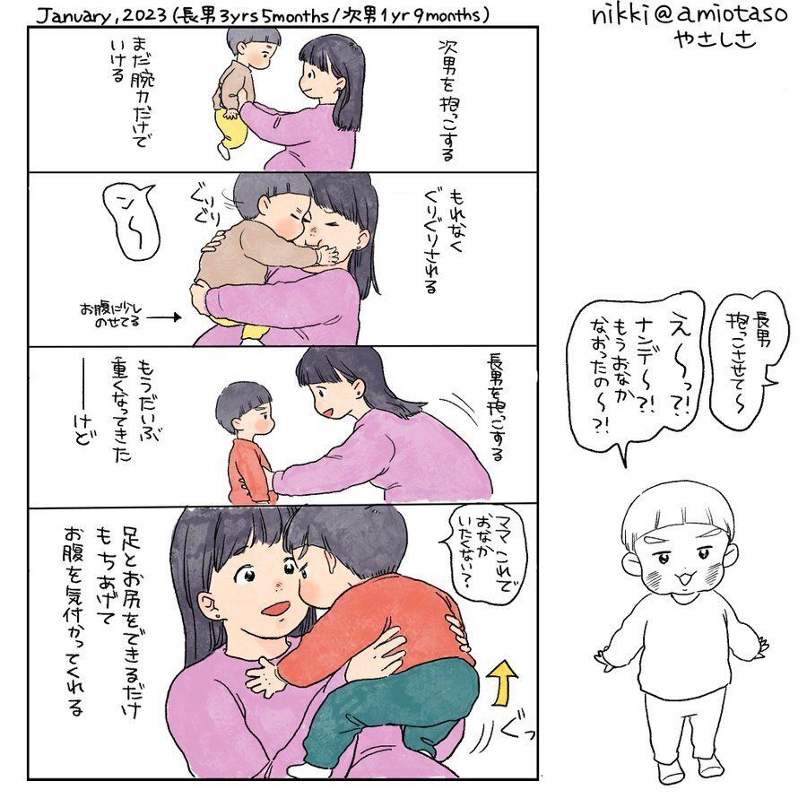 「小さい子どもながらに、母親(私)の様子をよく見てくれているんだなと。臨月には、よくお腹が張っていたこともあり、そのことを覚えていて、気にしてくれていたんだなぁと感心しました。一方で、我慢をさせちゃっていないかな?と気になったりもしました」