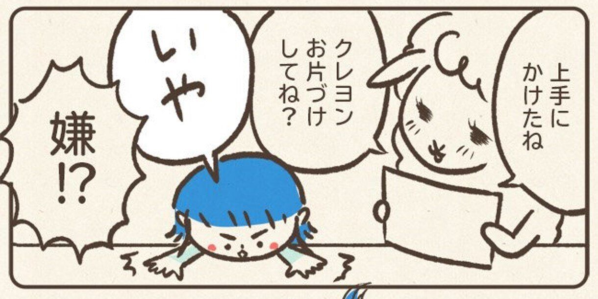 お絵描きが終わり、上手に描けたことをほめつつ「クレヨンを片づけてね」と言うと「いや」と答える姫丸ちゃん。その理由は…。