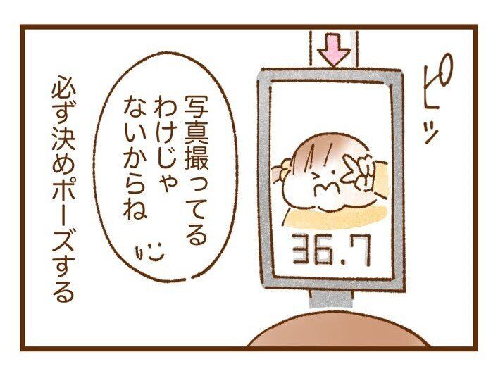 お子さんを一人ずつ検温器の高さに抱き上げるのは大変だと思います。けれどノリノリでかわいいポーズを決めてくれたら、見ている方まで楽しくなりそうです。