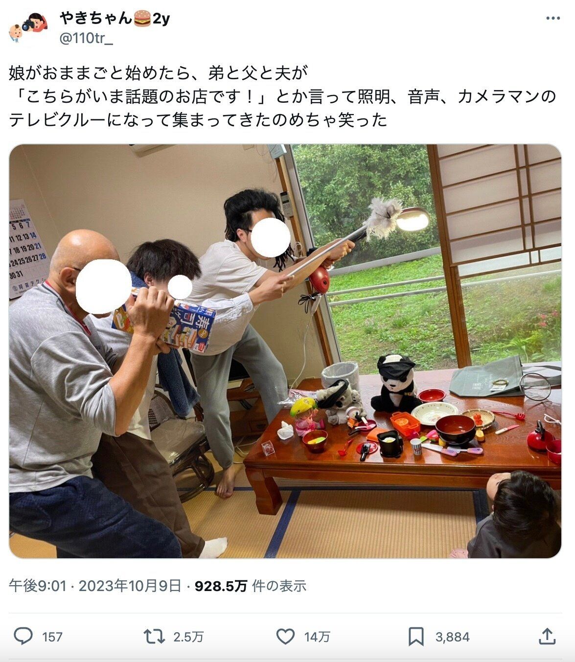 娘さんがおままごとを始めたところ、その場にいた夫・弟さん・お父さんが即興でテレビクルーになりきり、「こちらがいま話題のお店です!」と言って集まってきたそうです!