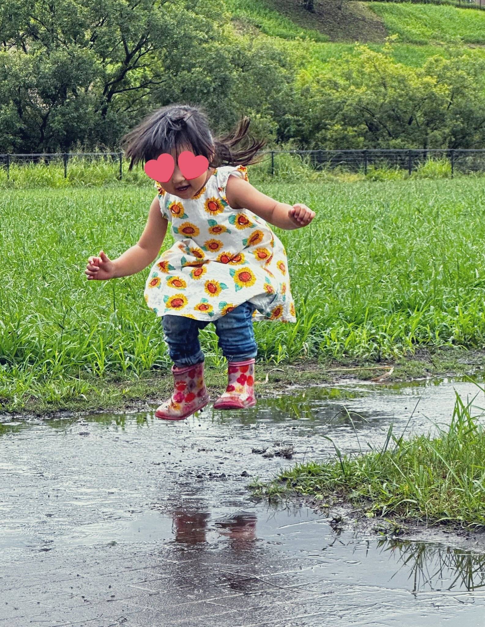 写真には、水たまりに向かって娘さんが大ジャンプした瞬間が!