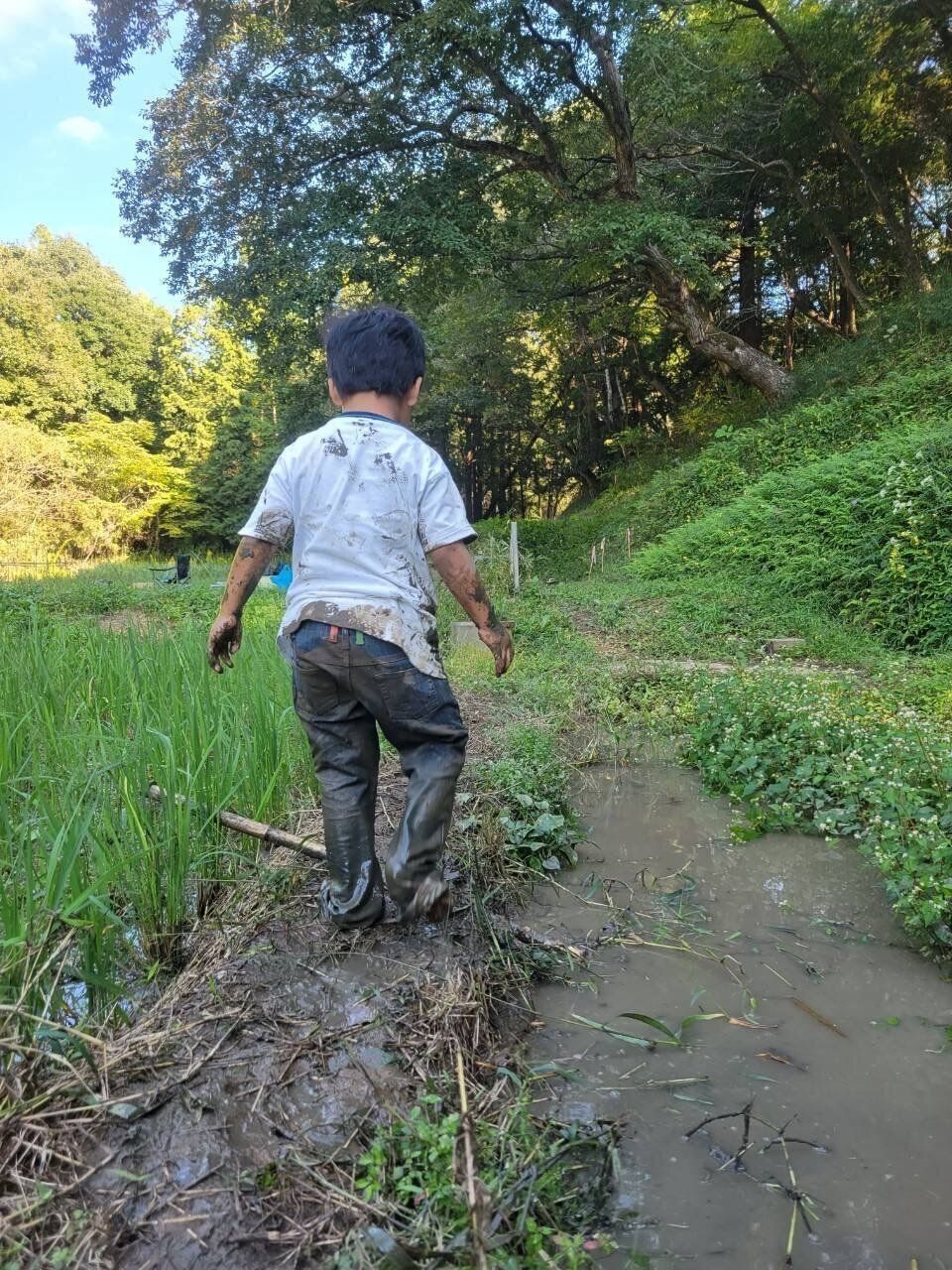 5歳のお兄ちゃんも、ズボンが何色かわからないほど見事に泥まみれです!膝まで浸かる大きな水たまりで、思いきり遊べて楽しそうですね!