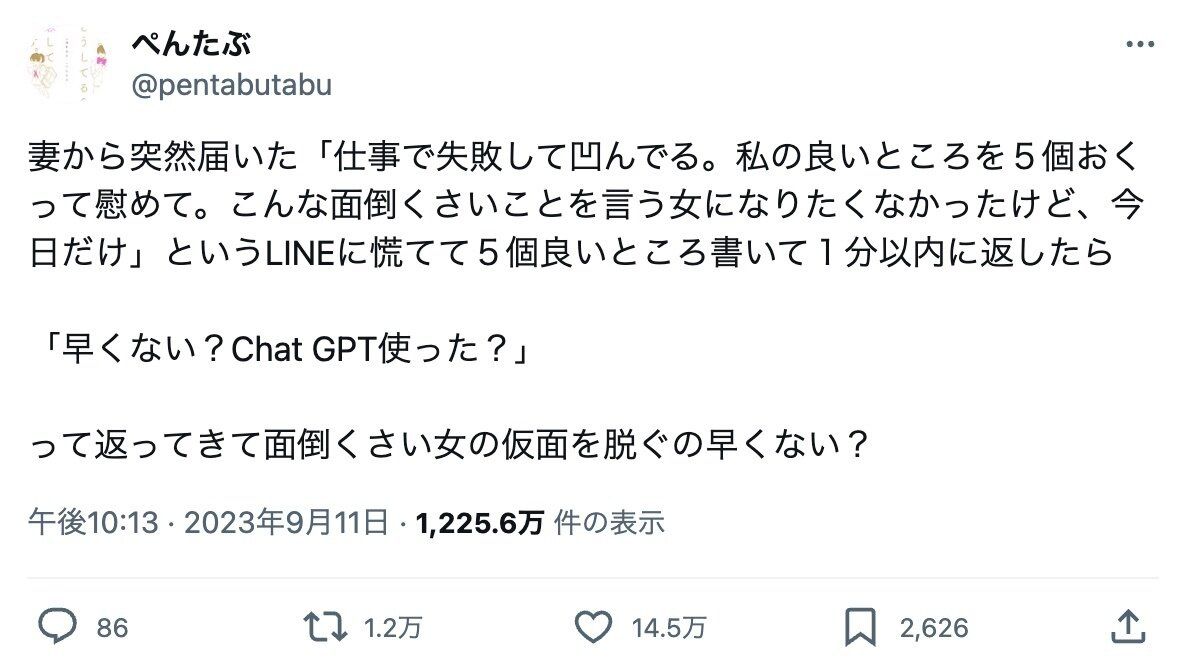ところがあまりの回答の早さに、妻に「早くない?Chat GPT使った?」と、ぺんたぶさんはAIチャットサービスの使用を疑われてしまったのです!