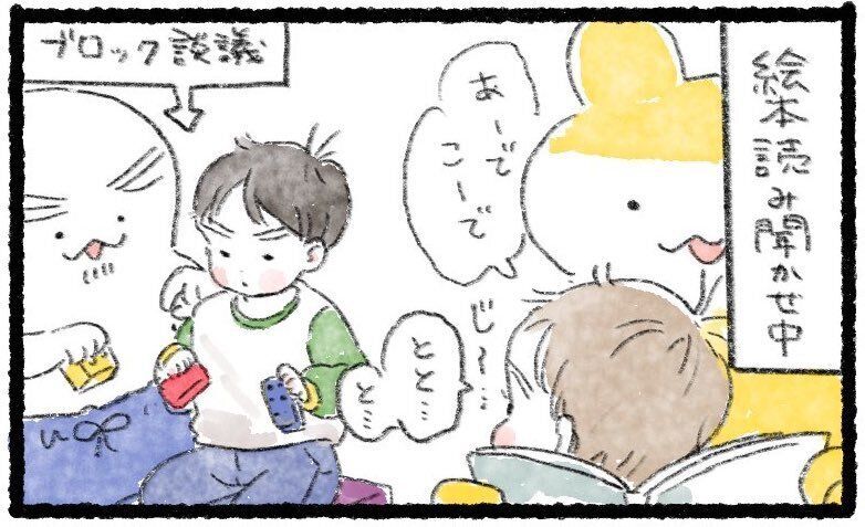 きーくんは、絵本そっちのけでうーくんの方をじーっと見ながら、「とと……」と、何か言いたげな表情です。