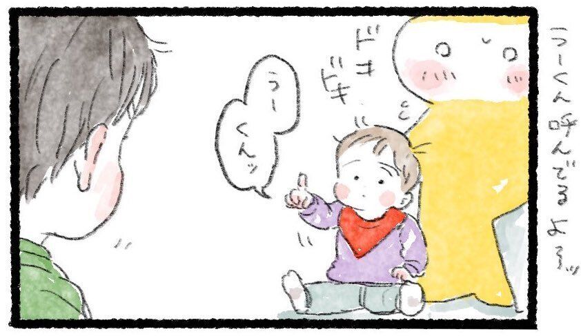 何度もお兄ちゃんを指さして、「うーくんッ」と呼ぶきーくんを見て、まくらこさんは「うーくん、呼んでるよ〜ッ」と心の中で叫びます。