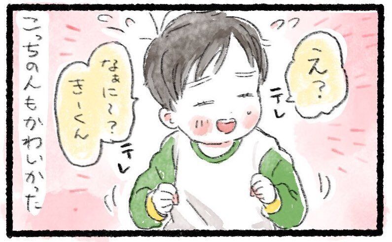 一生懸命にお兄ちゃんの名前を呼ぶきーくんの姿と、照れるうーくんの姿にほのぼのしますね。