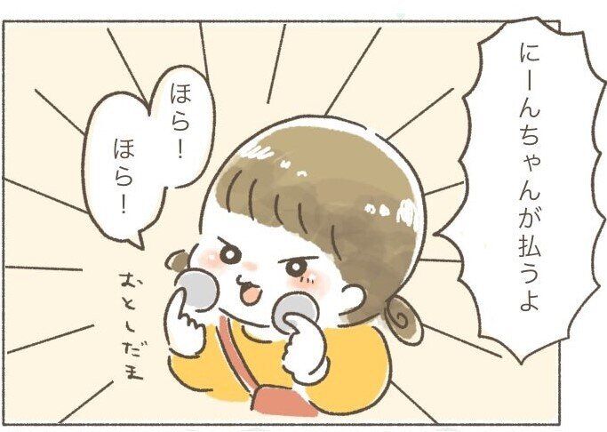 「にーんちゃんが払うよ!ほら!ほら!」とお年玉の小銭を手に持って張り切っています。