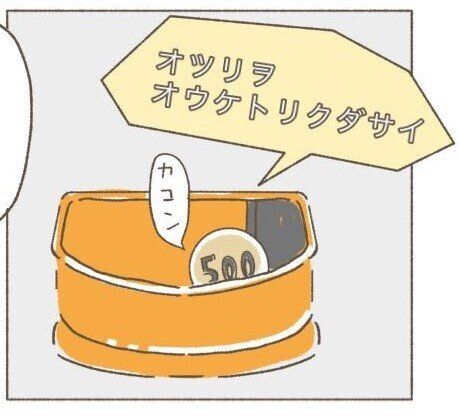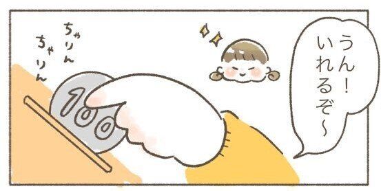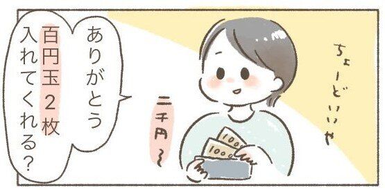 トモミさんは2,000円を入れると「ありがとう、100円玉2枚入れてくれる?」とにーんちゃんにお願いをしました。
