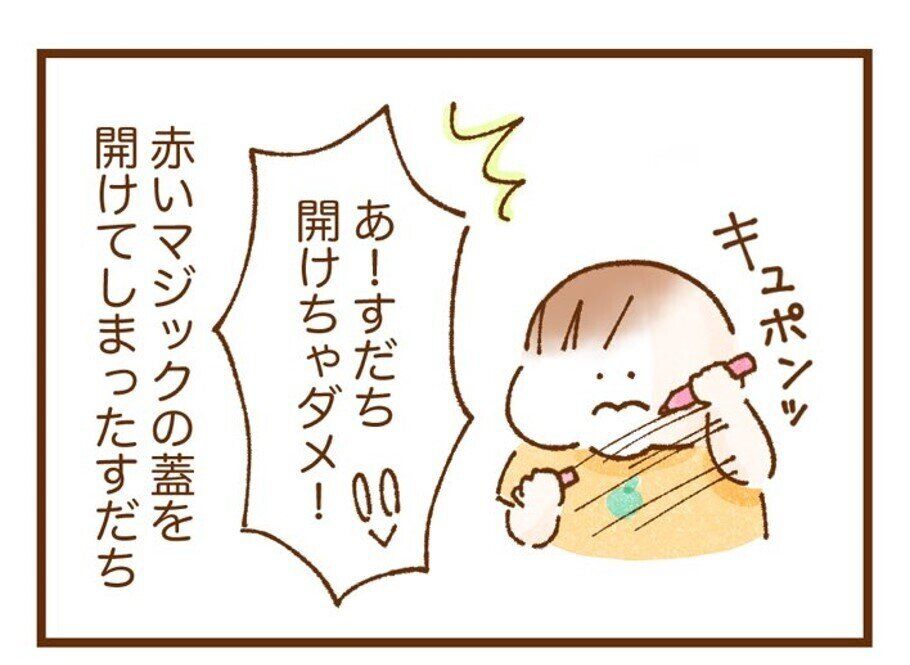 ママの静止が届かず、赤いマジックの蓋を開けてしまったすだちちゃん。