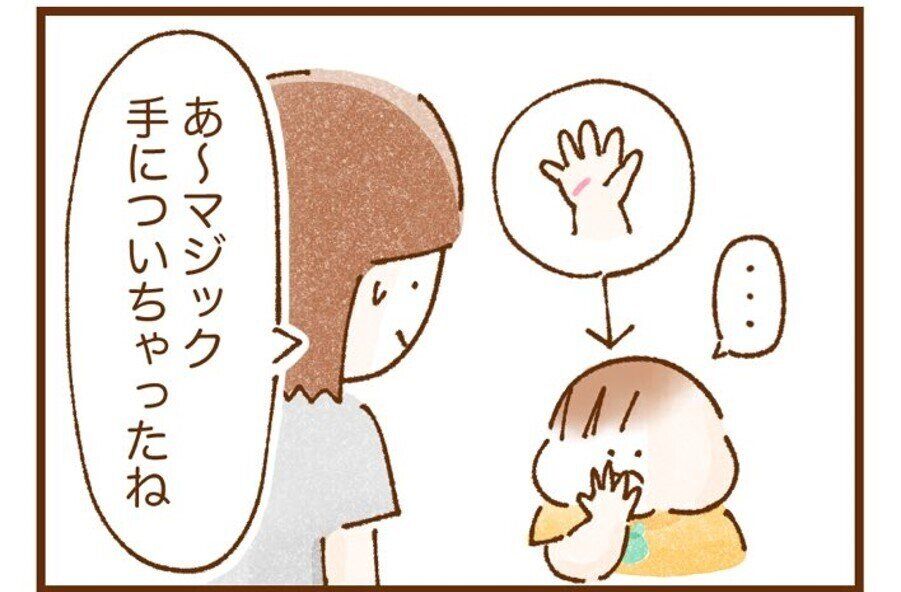 結果、マジックで手に赤い線がついてしまったようです。手についた赤い色をじっと見つめるすだちちゃん。すると……。