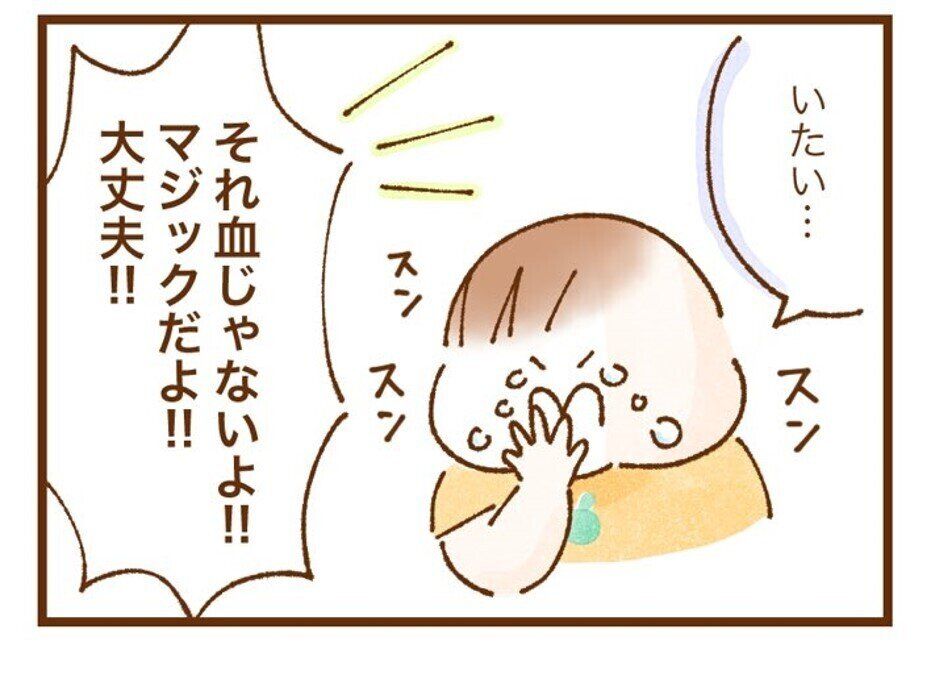 すると、一言「いたい……」。手の赤い色を見て血だと思い、痛い気持ちになってしまったようです。実際には痛くないのに、連想して痛がるすだちちゃん、かわいらしいですね。