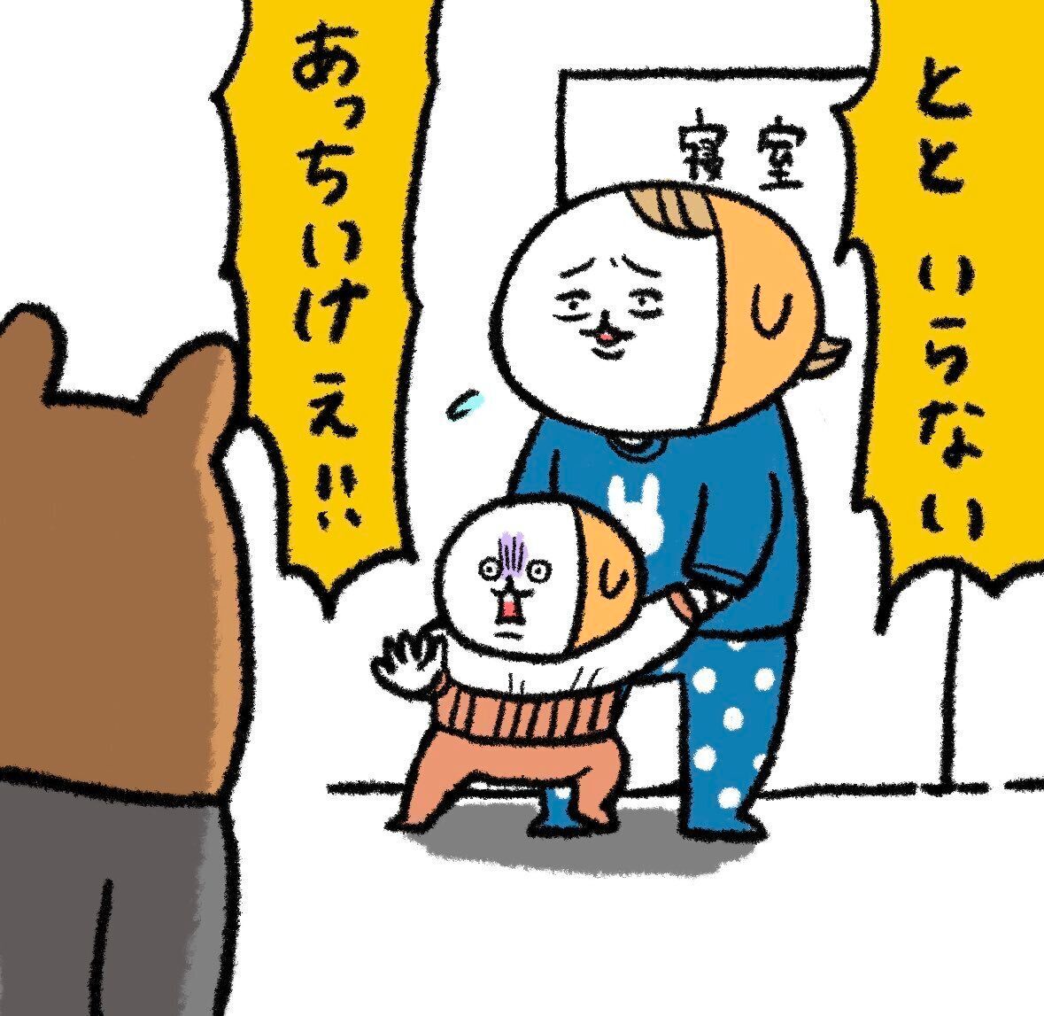 「あっちいけえ!!」と言われたととさんの背中には、哀愁がただよっています。こうどんくんの眉間のシワと、シャツがインされたかわいいパジャマ姿とのギャップがすごいですね。